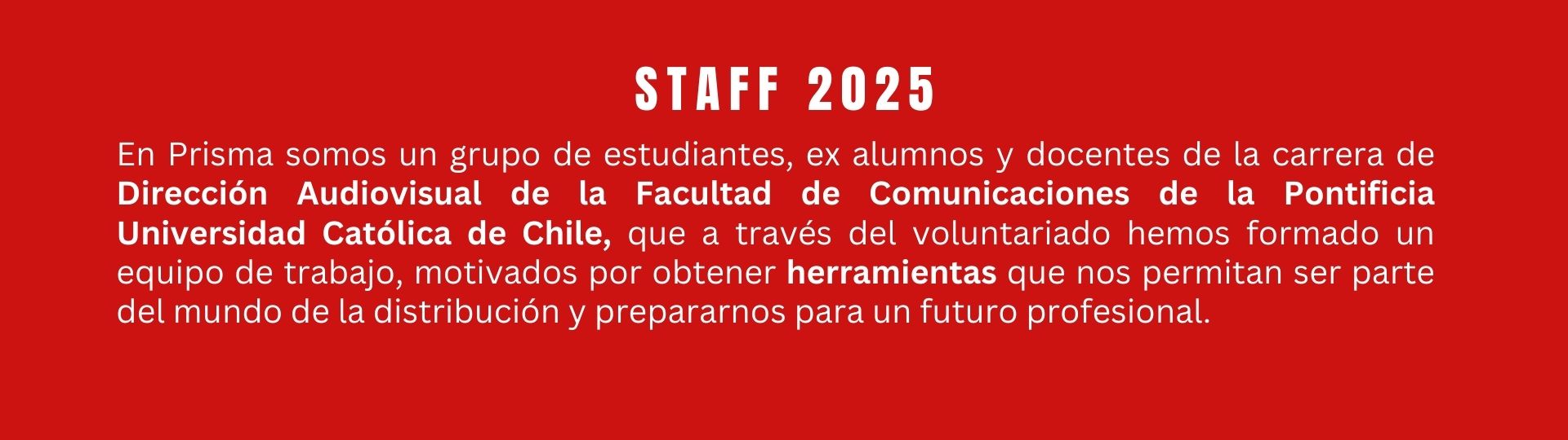 Prisma es una distribuidora de cortometrajes universitarios creada por y para estudiantes. Nos dedicamos a la difusión de cortos realizados por alumnos de la carrera de Dirección Audiovisual de la Pontificia Universidad Católica de Chile. Nuestro trabajo se basa en el esfuerzo voluntario y colaborativo, formando una red donde alumnos distribuyen las obras de sus propios compañeros.